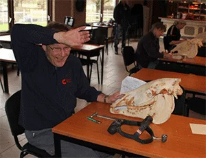 Maar liefst 23 kandidaten welke de theorietoets al met goed resultaat hadden afgesloten, hadden zich opgegeven voor het eerste gedeelte van het praktijkexamen. Het examen bestond uit 8 werkstations waar de kandidaten 4 slachthuispreparaten en 4 geconserveerde schedels moesten onderzoeken. Dit onderzoek moest natuurlijk ook worden vastgelegd op een zeer overzichtelijke dental chart. Per station kregen de kandidaten 15 minuten tijd om deze beide zaken uit te voeren. De ruimte waar de slachthuispreparaten stonden opgesteld was niet verwarmd. Nou was dat niet echt een probleem wat het was hard werken geblazen. Zelf mocht ik beginnen met preparaat nummer 1 behorend bij een ouder paard met maar liefst 8 behoorlijke afwijkingen. Dus na 15 minuten kon de jas al uit. Voor de inwendige mens werd door Christie goed gezorgd want je kon steeds een verse kop koffie of thee krijgen. Na twee uur zwoegen dan het examen met elkaar nabespreken. Heb je bij dat nummer dat gezien of bij die schedel dit. Ramps, haken, diastases, scheve beet, wortelpunten van alles kwam langs. Oei dacht ik toen heb ik dat allemaal wel gezien. Tijd om zenuwachtig te worden kreeg ik niet want ik mocht toezien op het verloop van het examen van de tweede groep.